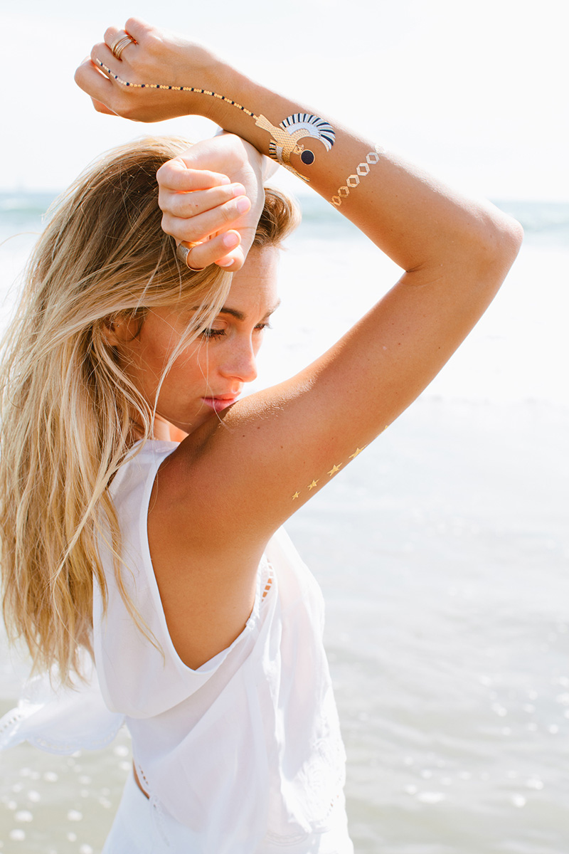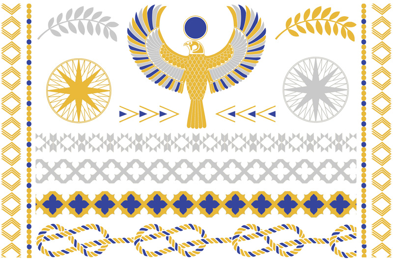 青とゴールドが彩る古代エジプシャンな壁画模様がエキゾチックな女性を演出します。